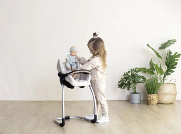 Praktičen komplet za punčke v izvedbi 3v1, ki služi kot avtosedež, gugalnik in visok jedilni stolček. Z enostavnim obračanjem konstrukcije se hitro preoblikuje, primeren je za punčke do 42 cm in navduši z modernim bež dizajnom.