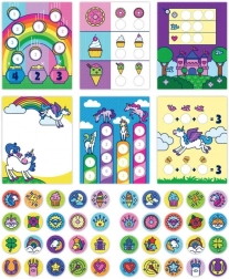 Komplet nalepk z magičnim motivom samorogov spodbuja fino motoriko, domišljijo in potrpežljivost. Zahvaljujoč priročnemu razdeljevalniku otroci nalepke zlahka jemljejo in lepijo na označena mesta na slikovnih listih. Nalepke so večkrat uporabne, zato zabava kar traja.