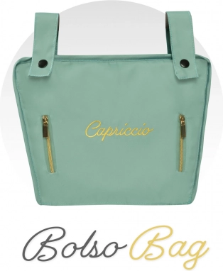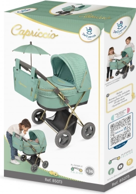 Stilski voziček za punčke iz kolekcije Capriccio 2025 navdušuje z modernim dizajnom v mentolovo zeleni barvi, nizko težo in enostavnim upravljanjem. Ponuja zložljivo konstrukcijo, senčnik, odstranljivo torbo z zlatimi zadrgami, mehko blazino in praktičen odlagalni koš – idealno za mlajše otroke od 3 let dalje.