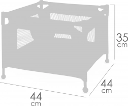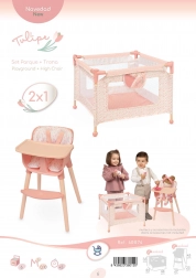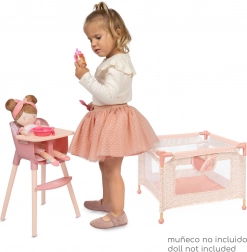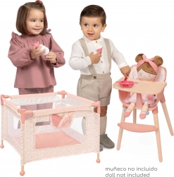 Set vključuje trdno igralno ogrado z mrežastimi stranicami in praktičnim žepom za malenkosti ter tudi jedilni stolček z odstranljivim pladnjem in tritočkovnim pasom za varno namestitev punčke. Oba izdelka sta zasnovana za punčke do 36 cm in izstopata po enostavni uporabi in vzdrževanju.