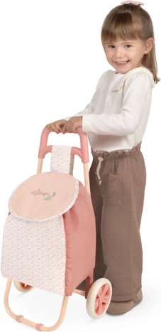 Lahka in zložljiva otroška torba na kolesih iz kolekcije Tulipe navduši z nežnim cvetličnim dizajnom, preprostim upravljanjem in prostornim tekstilnim žepom. Idealna za igro trgovine, potovanja s punčkami in prenašanje igrač.