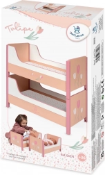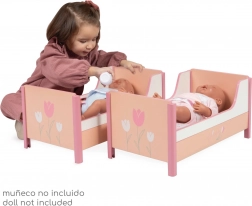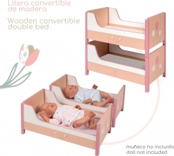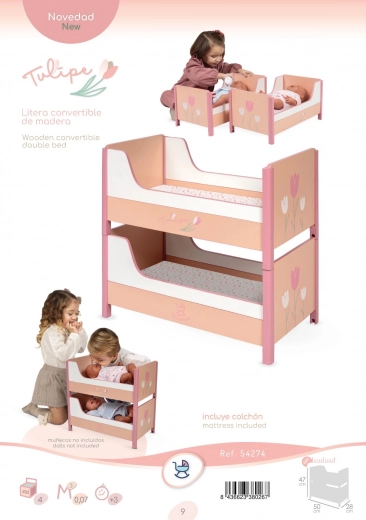 Privoščite otrokom čudovito prizorišče za njihove najljubše punčke. Lesena posteljica 2 v 1 iz kolekcije Tulipe v toplih lososovih tonih s stilskim cvetličnim vzorcem omogoča tako pogradno spanje kot razstavitev na dve samostojni postelji. Precizna španska zasnova in čvrsta konstrukcija iz MDF-ja in masivnega lesa zagotavljata dolgo življenjsko dobo in varno igro.