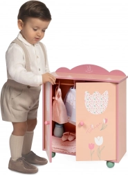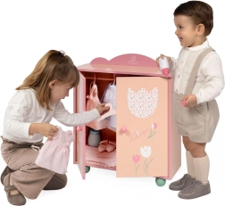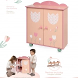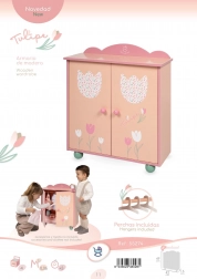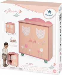 Stilska lesena garderobna omara za punčke iz kolekcije TULIPE navduši z nežnim pastelnim dizajnom, dovršeno izdelavo in praktično notranjo razporeditvijo. Vključuje garderobno palico in 3 lesene obešalnike za pregledno shranjevanje oblačilc. Odličen dodatek za dekliško sobico, idealno za otroke od 3 let dalje.