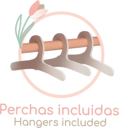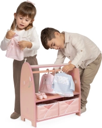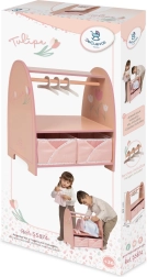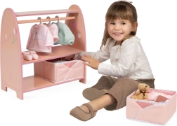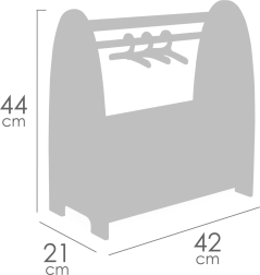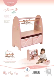 Podarite otrokom red v svetu punčk. Ta kompaktni leseni garderobni obešalnik iz kolekcije TULIPE prinaša praktično rešitev za obešanje in shranjevanje oblačil ter dodatkov. Garderobna palica s 3 lesenimi obešalniki sprejme oblačila do dolžine približno 19 cm, spodnja polica in 2 zložljivi tekstilni košarici pa poskrbita, da je vse ostalo lepo pri roki.