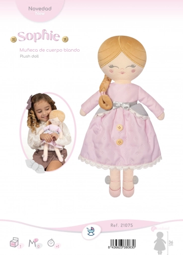 Predstavljamo ljubko plišasto punčko Sophie v velikosti 36 cm iz nove kolekcije 2025. Izdelana je iz visokokakovostnega sijočega pliša, je mehka, lahka in idealna za crkljanje in potovanja. Punčka je ročno pralna pri 30 °C in navduši z nežnim španskim dizajnom v odtenkih svetlo rožnate s sivimi in belimi detajli.