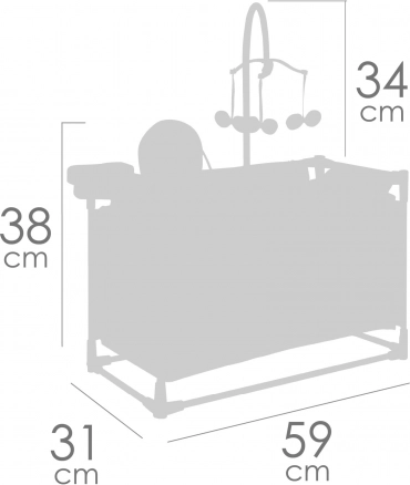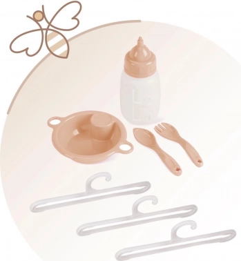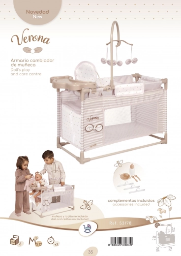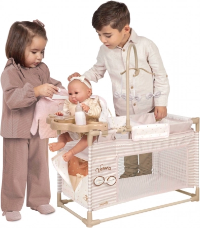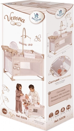 V kompletu je vse, kar male mamice potrebujejo: vrtiljak za zabavo punčke, previjalna mizica za nego, jedilni stolček s stekleničko, skledico in priborom ter praktična omarica na zadrgo z obešalniki. Ležiščni del z mrežastim okencem omogoča, da imajo otroci punčko vedno na očeh, prostorna osnova pa zagotavlja udobje pri igri.