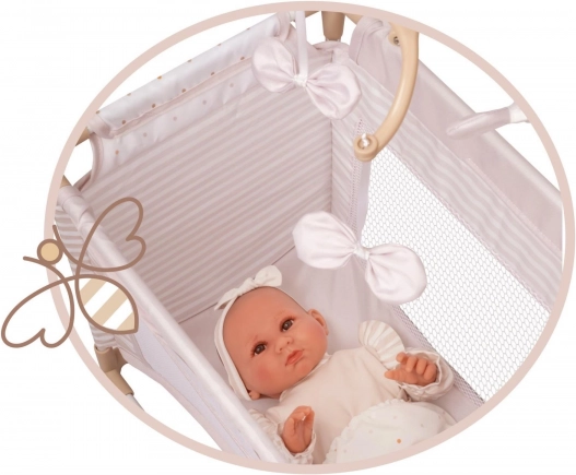 Ta elegantna posteljica za punčke v pastelnih tonih bež in bele stilsko dopolni vsako otroško sobo. Združuje naraven videz z ljubkimi detajli, kot so pikice, črtice in diskretne mašnice, ki spominjajo na cvetne lističe. Zaradi kakovostne izdelave in stabilne konstrukcije je igra varna in udobna.