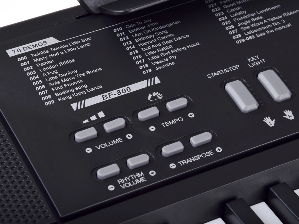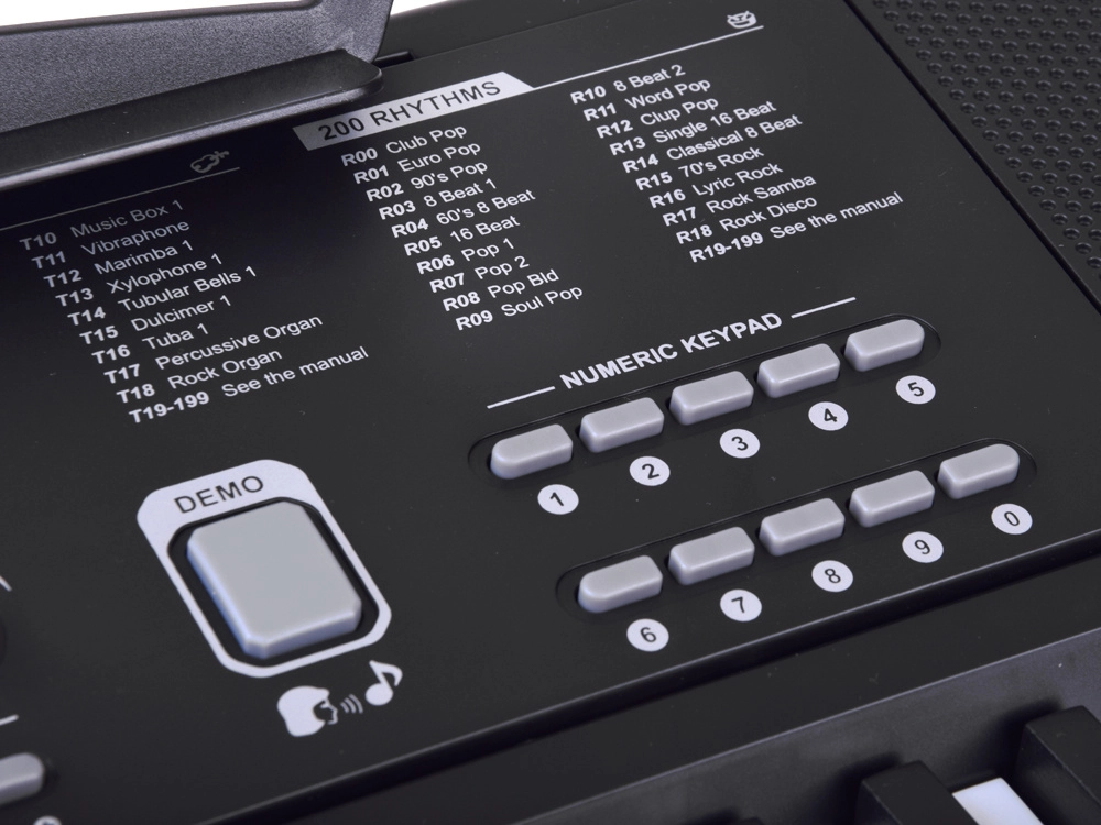 Izbirate lahko med 200 zvoki (klavirji, orgle, godala, pihala in sodobni sintetizatorji) ter 200 spremljevalnimi stili od popa in rocka do jazza in disca. Ne manjka 70 demo skladb za navdih in učenje, funkcija Record/Play za snemanje lastnih idej in Numeric Pad za hitro številčno vnašanje.