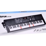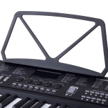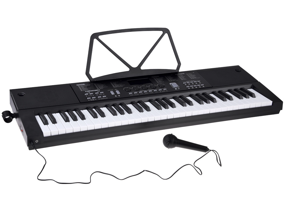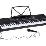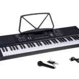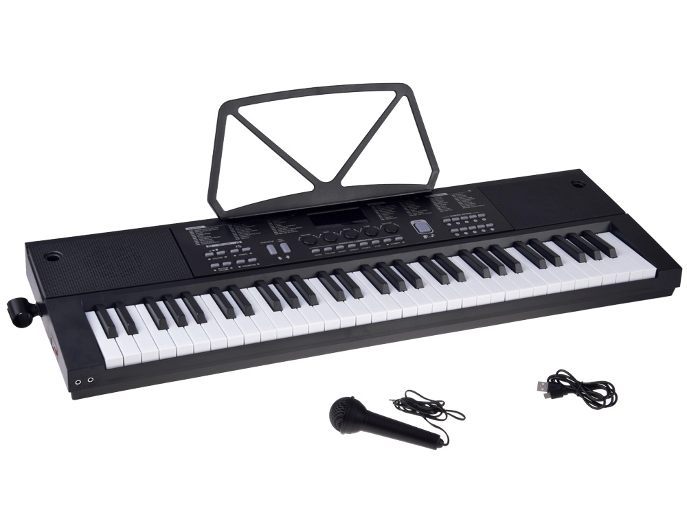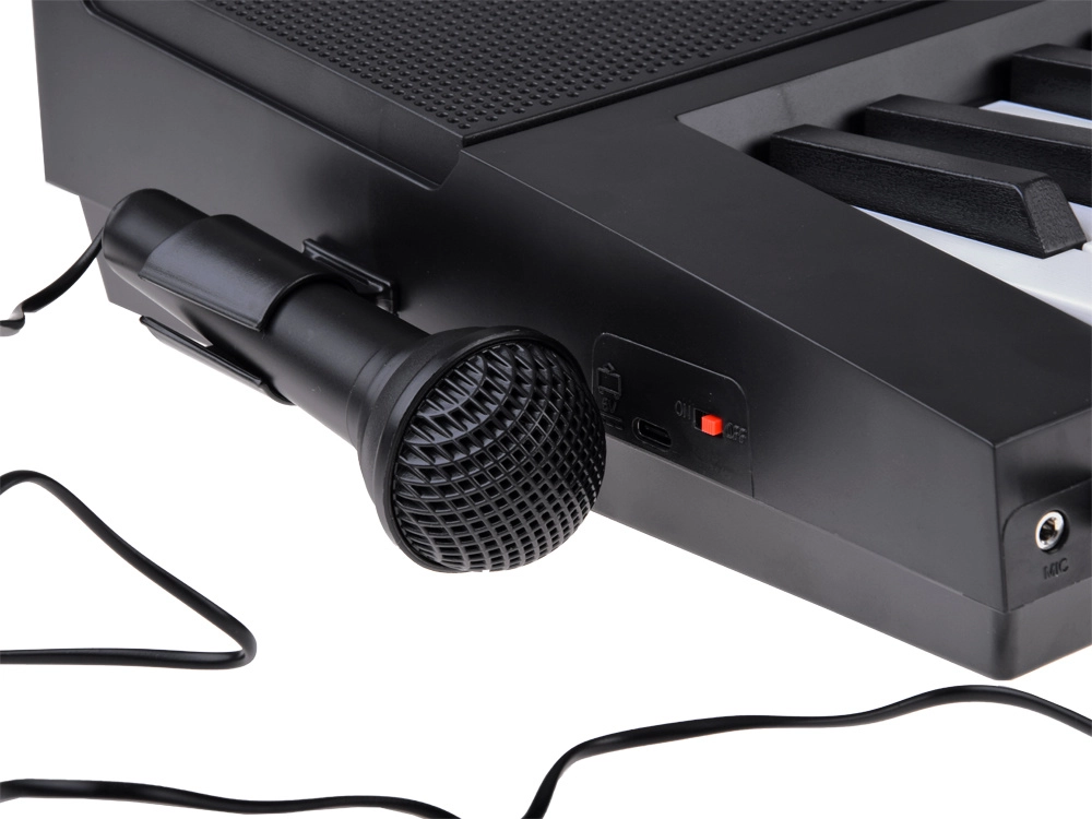 Praktična povezljivost vključuje USB in vhod za mikrofon. V paketu so mikrofon, notno stojalo in USB-kabel. Zaradi kompaktnih mer, vgrajenih zvočnikov in bočnega gumba za vklop je instrument pripravljen na igranje kadarkoli.