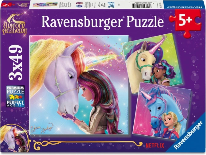 Sestavljanka RAVENSBURGER 3×49 kosov UNICORN ACADEMY. Antirefleksna površina, tehnologija SoftClick, trpežni koščki. Odlična zabava za otroke od 5 let.