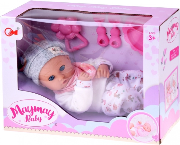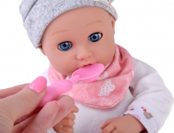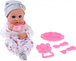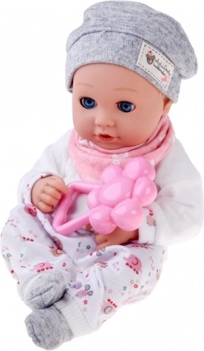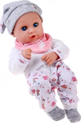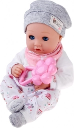 Ta punčka je izdelana iz prijetnega, mehkega materiala s plastično glavo in rokami za vzdržljivost. Obleka v nežnih barvah vključuje sivo kapico, mehko bluzico, vzorčaste hlače in sive nogavičke. Zahvaljujoč premičnim vekam punčka verno posnema spanje in budnost ter spodbuja naravno skrb in empatijo.
