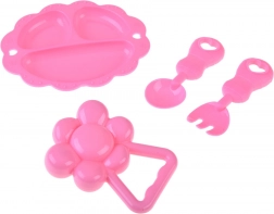 Del kompleta je praktičen set za hranjenje v rožnati barvi – krožniček, žlička in vilica – ter tudi ropotuljica. Otroci lahko tako v celoti uživajo v igri vlog, razvijajo domišljijo, fino motoriko in socialne veščine.
