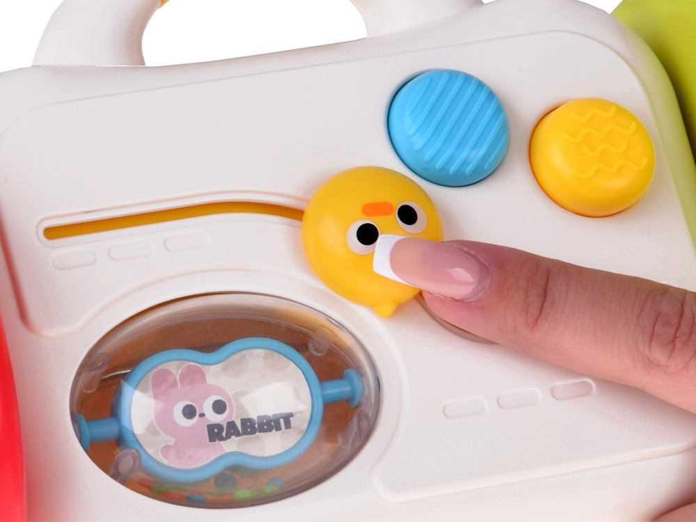 Interaktivna igrača na kolesih združuje zabavo in učenje v enem. Otroka pritegnejo žive barve, različne teksture, gumbi in drsniki, prozorno okence s kroglicami ter ogledalo za varno samospoznavanje. Ročaj olajša prenašanje, zato je igrača odličen spremljevalec doma in na poti.
