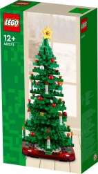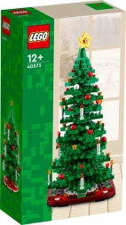 LEGO Božično drevo 40573. Pisano drevo krasijo okraski, svečke in dekorativno stojalo. Zahvaljujoč izvedbi 2 v 1 lahko zgradite eno veliko drevo ali dve manjši, na vrhu pa vse zaključite z zvezdo.