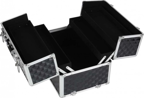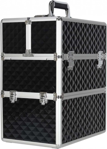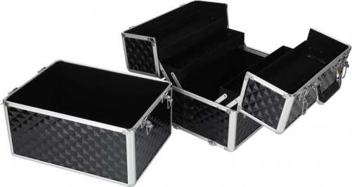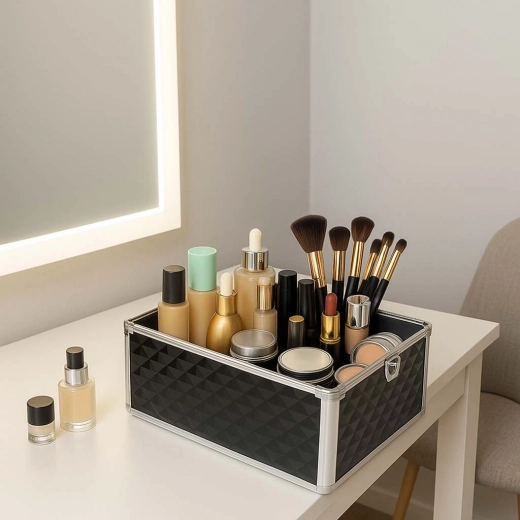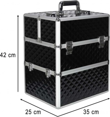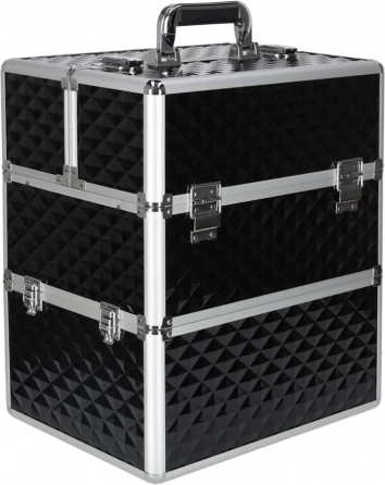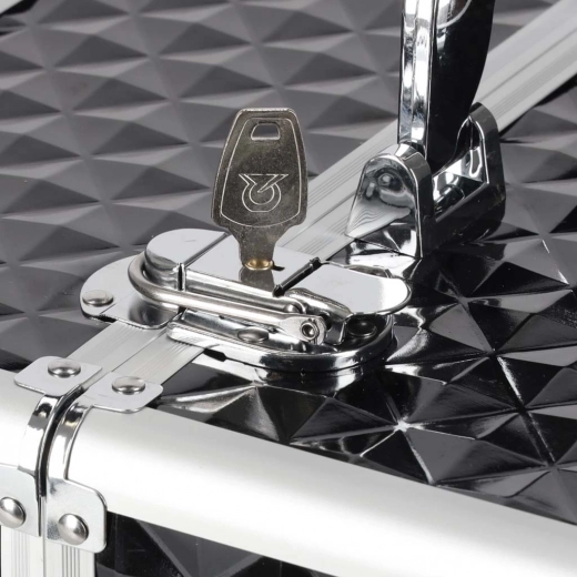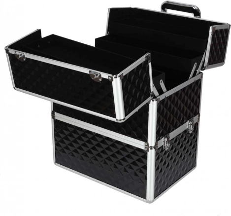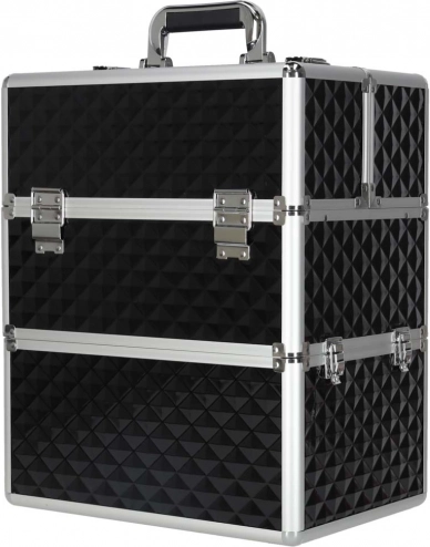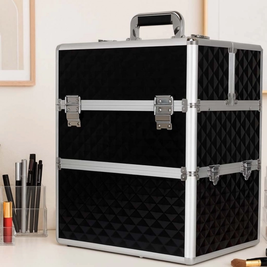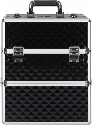Eleganten in prostoren kovček za kozmetiko XXL z diamantnim vzorcem ponuja maksimalno organizacijo, zložljiv pokrov z izvlečnimi predali in zaklepanje z dvema ključema. Zaradi čvrste konstrukcije, kovinskega okvirja in udobnega ročaja je idealen za vizažiste in ljubitelje ličenja na poti.