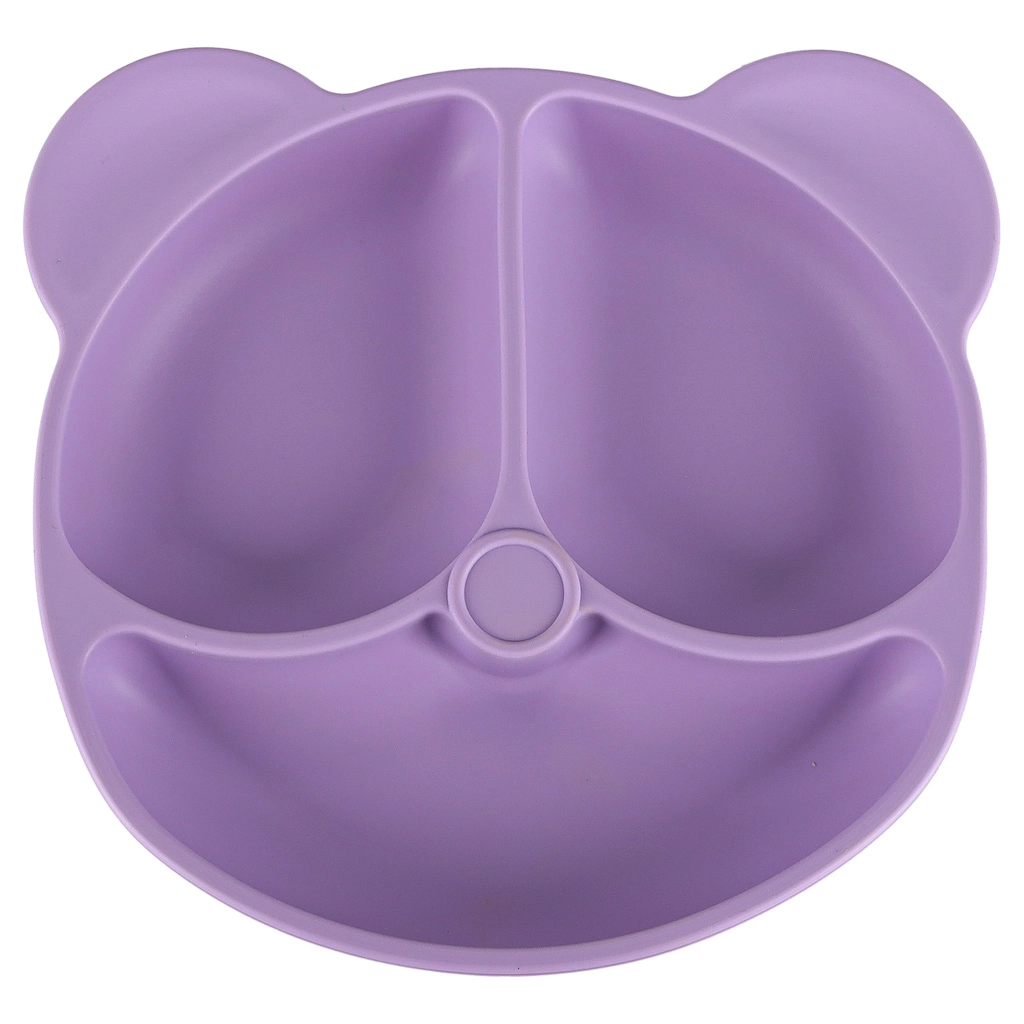 Razdeljen krožnik v obliki medvedka in skledica s priseskom trdno stojita na mizi ali pladnju stolčka, zato se zmanjšajo nezgode in prevrnitve med hranjenjem.
