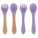 Popoln silikonski jedilni set za otroke v elegantni vijolični barvi olajša prve korake k samostojnemu hranjenju. Vsebuje vse potrebno: razdeljen krožnik s priseskom, skledico s priseskom, učečo skodelico s pokrovčkom in slamico, 2 žlički in 2 vilici ter nastavljiv slinček z žepkom. Izdelano iz varnega silikona brez BPA, primerno za pomivalni stroj in mikrovalovno pečico.
