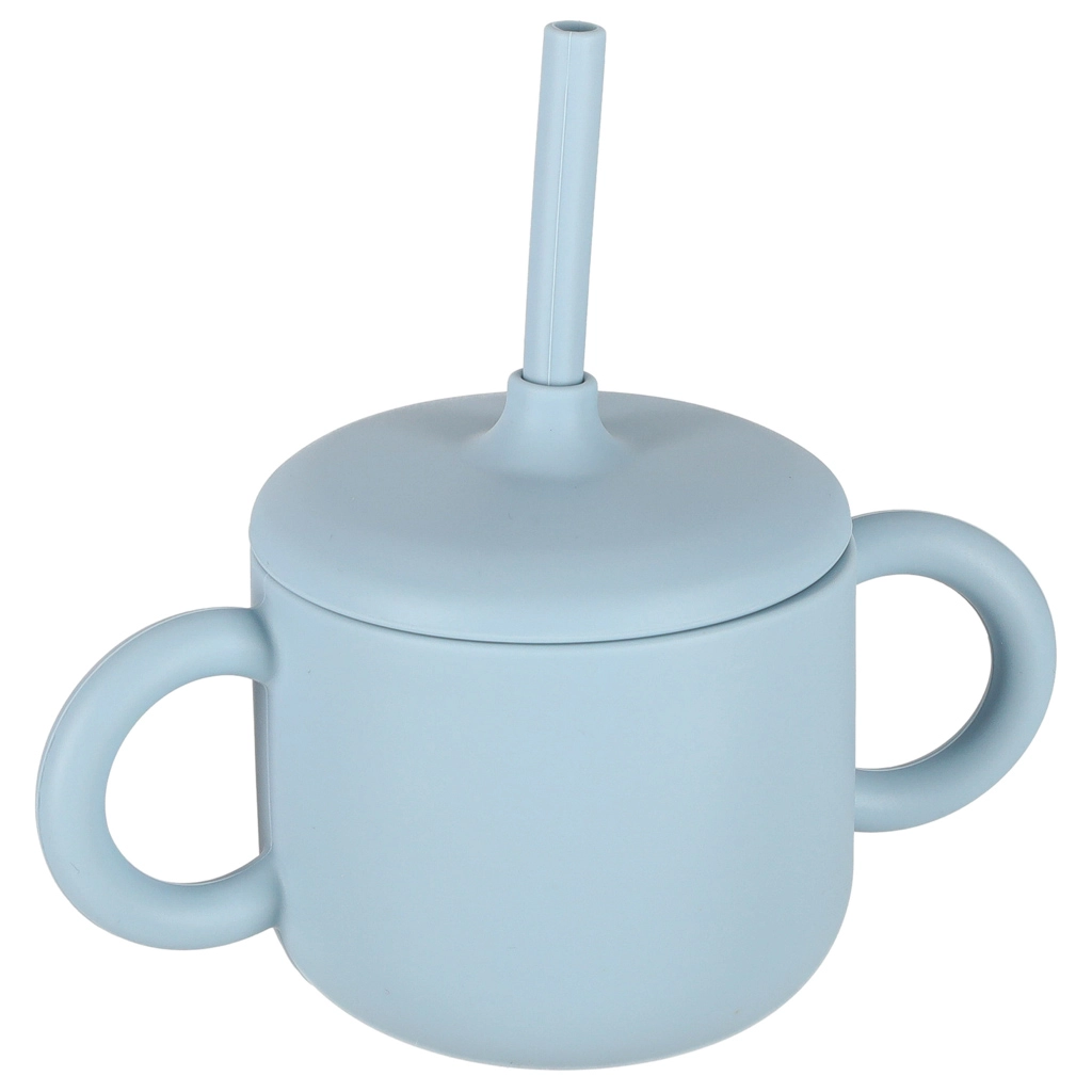 Dvoročajni silikonski lonček s pokrovom in integrirano slamico olajša prehod od stekleničke. Mehak površinski oprijem ne drsi in je prijazen do malih rok.