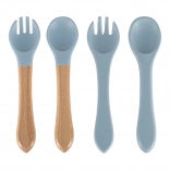 Nastavljiva silikonska slinčica z globokim žepom ujame večino ostankov in ščiti oblačila. Dva kompleta pribora (silikonski in z lesenim ročajem) podpirata različne faze učenja prijema in zajemanja. Lonček s pokrovom in slamico pomaga vaditi samostojno pitje brez nepotrebnega polivanja.