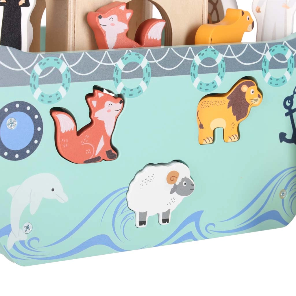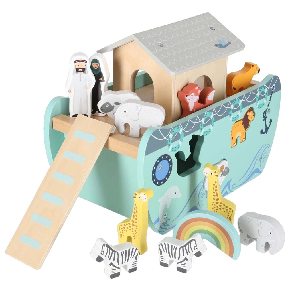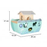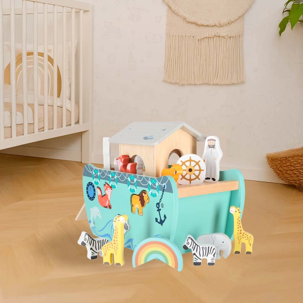 Odkrijte leseno igračo, ki združuje vstavljalnik oblik, prosto igro in pripovedovanje zgodb. Barka z odstranljivo rampo in streho skriva komplet živalskih figuric ter dve figuri Noeta z ženo – otroci lahko ladjo nakladajo, jo krmilijo s krmilom in živalice vstavljajo v prave odprtine.