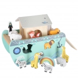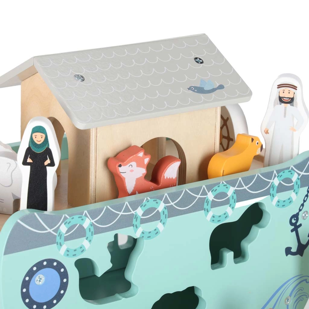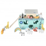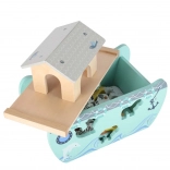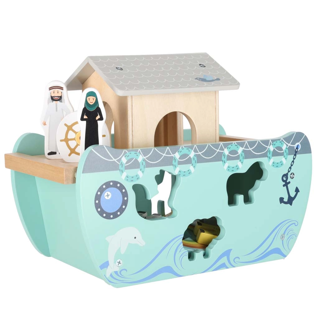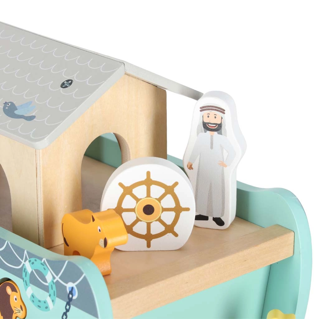 Odkrijte leseno igračo, ki združuje vstavljalnik oblik, prosto igro in pripovedovanje zgodb. Barka z odstranljivo rampo in streho skriva komplet živalskih figuric ter dve figuri Noeta z ženo – otroci lahko ladjo nakladajo, jo krmilijo s krmilom in živalice vstavljajo v prave odprtine.
