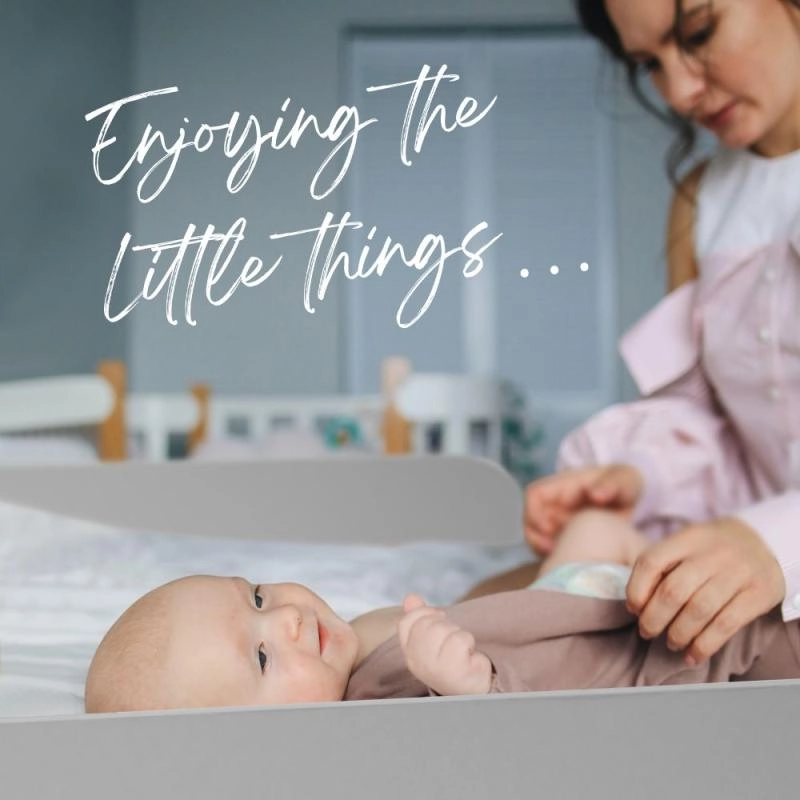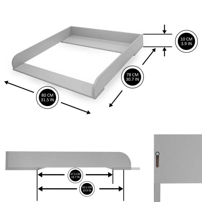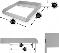 Ta siva lesena previjalna mizica spremeni vašo komodo v varno in ergonomsko mesto za vsakodnevno nego dojenčka. Zahvaljujoč premični sprednji plošči si nastavek zlahka prilagodite – pomik do 4 cm zagotavlja boljši doseg in udobje pri previjanju.