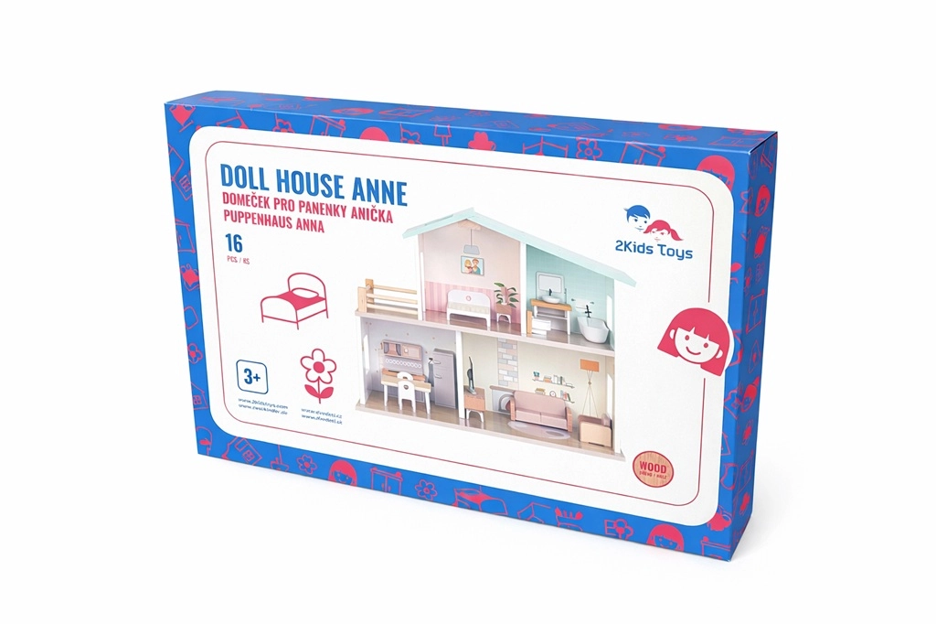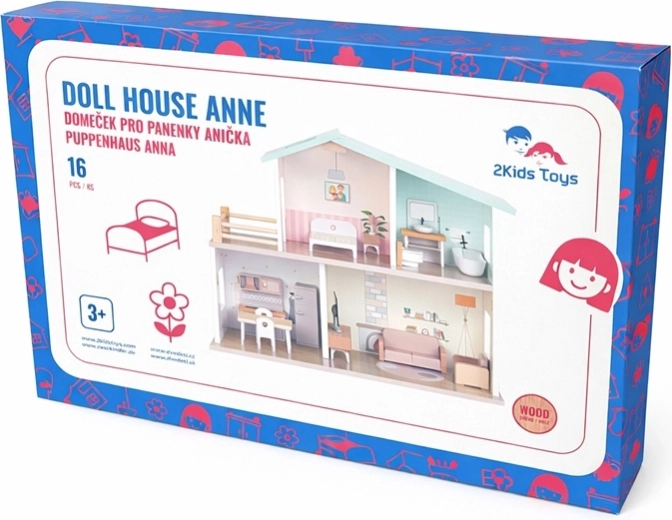 Odkrijte čudovito leseno hiško za punčke Anička znamke 2Kids Toys z dvema nadstropjema, balkonom in popolnoma opremljenimi sobami. Z 16 kosi pohištva in dodatkov bodo otroci uživali ure kreativne igre vlog, razvijali domišljijo in socialne veščine. Kakovostna lesena izdelava, nežne barve in stabilna konstrukcija jo naredijo za očarljiv dodatek otroški sobi. Priložen je navodilo za montažo; hiška je dostavljena razstavljena. Primerno od 3 let.