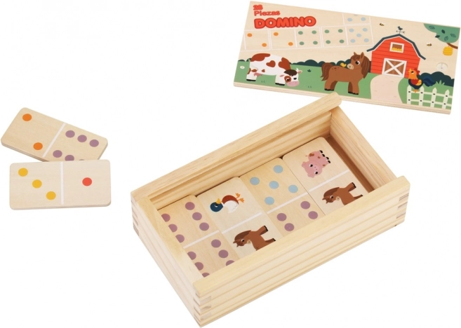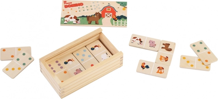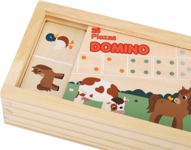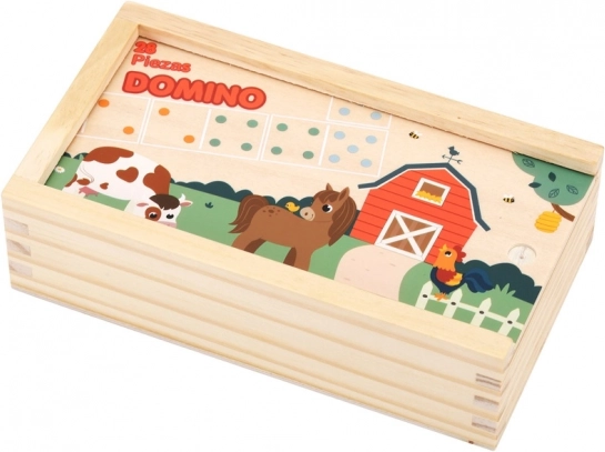 Dvostranske lesene domine Farma 2KIDS TOYS: slike živalic in pike v enem. Spodbuja logiko in motoriko. 29 delov, od 2 let, v lesenem zabojčku.
