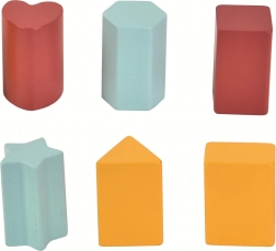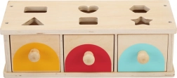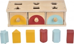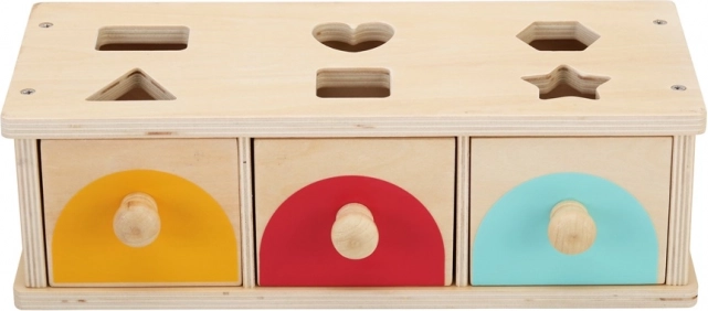 Zgornja plošča z izrezi vodi otroka k natančnemu vstavljanju, medtem ko trije predalčki z ročaji omogočajo enostavno jemanje koščkov in ponavljajočo igro. Trpežna izdelava zagotavlja dolgo življenjsko dobo in varno igro že od 1. leta.