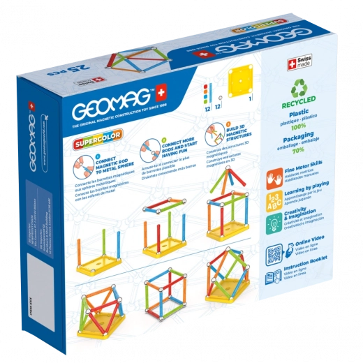 Sestavljanka GEOMAG Supercolor razvija otroško domišljijo, logiko in fino motoriko. Zahvaljujoč magnetnim spojem lahko otroci zlahka ustvarjajo različne oblike, stolpe in osnovne geometrijske konstrukcije. Žive barve in trdne jeklene kroglice zagotavljajo enostavno spajanje in stabilnost.