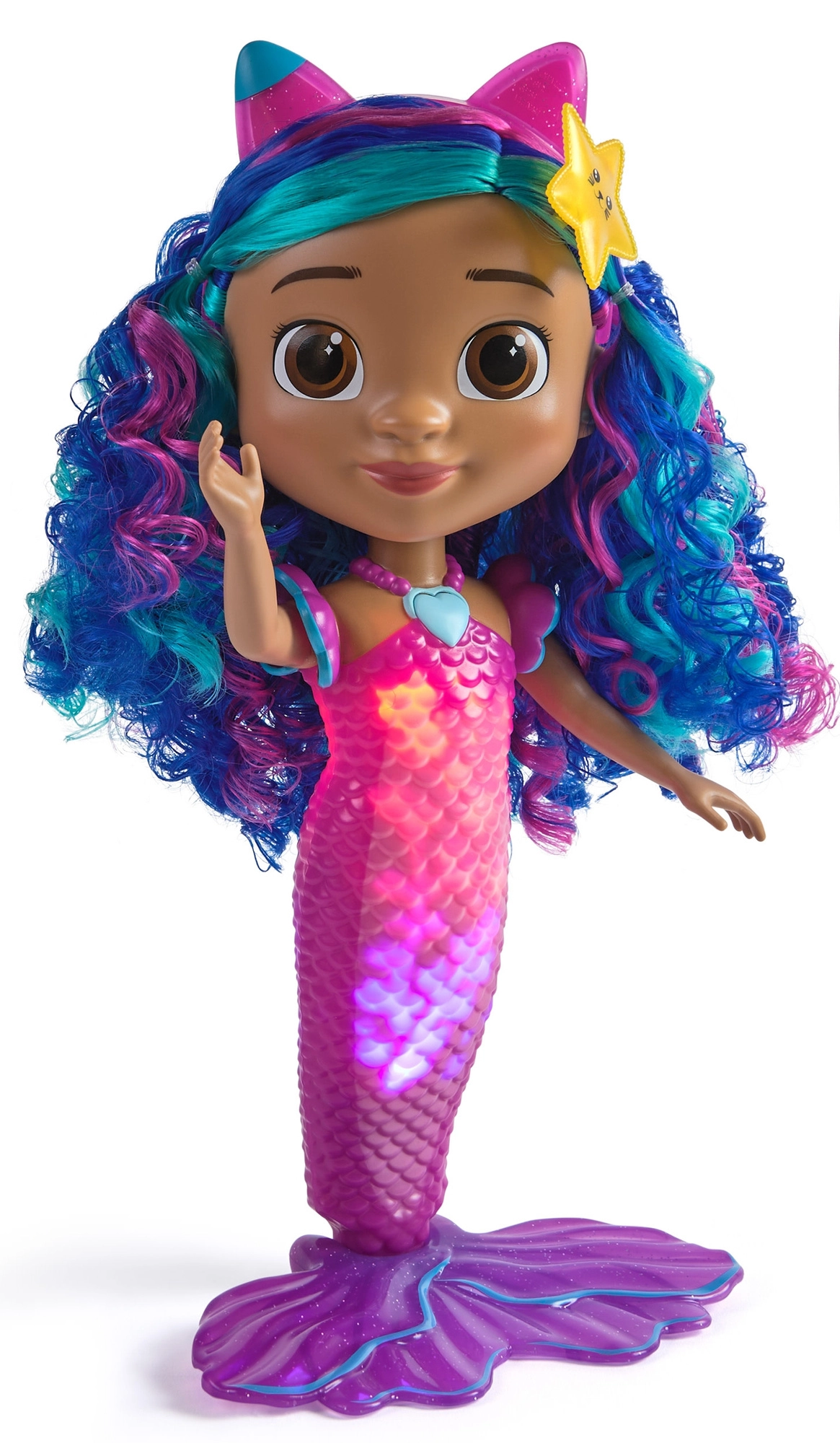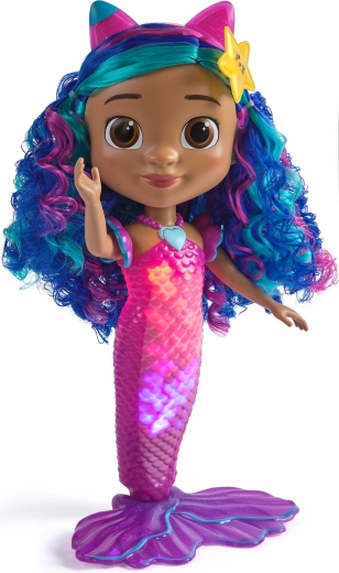 Morska deklica Gabina bo očarala otroke z izrazitimi barvami, igrivim dizajnom in interaktivnimi funkcijami. S pritiskom na ogrlico v obliki srca se vklopijo lučke in do 14 zvočnih učinkov, fraz in melodij, navdihnjenih s priljubljeno zgodbo. Barvit rep zasveti in poskrbi za čaroben prizor pri vsaki igri.