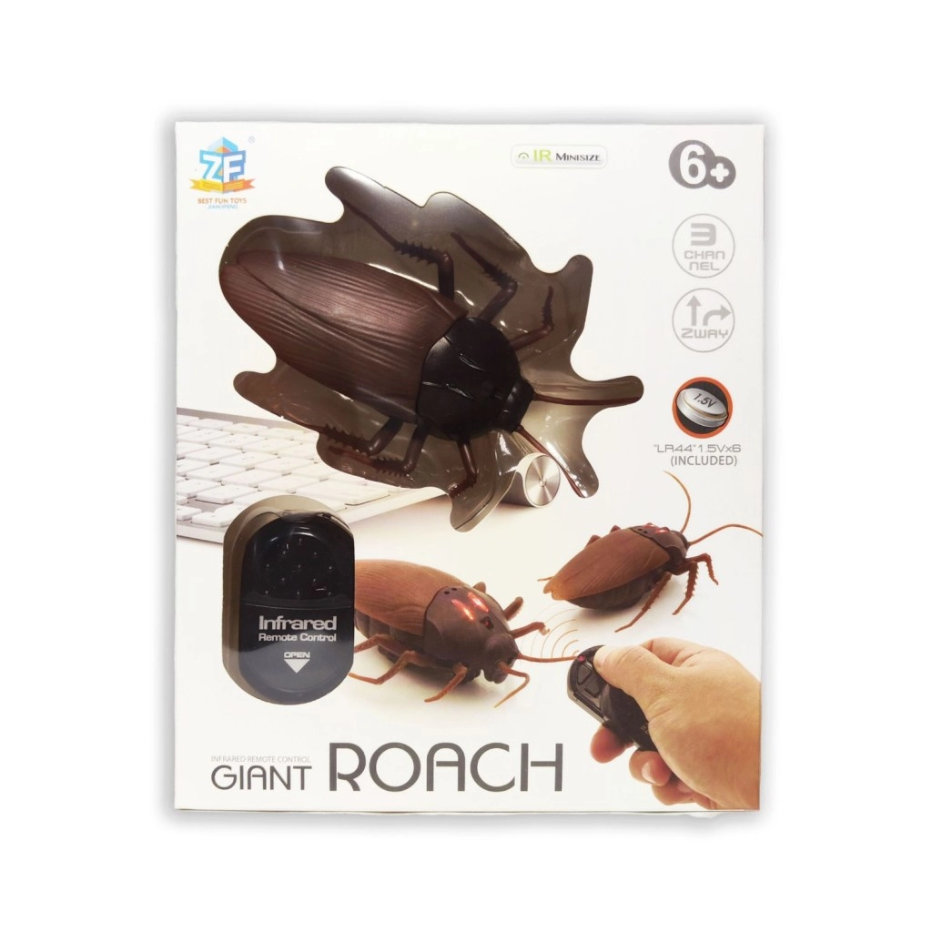 Zabavna igrača v obliki realističnega RC ščurka z infrardečim daljinskim upravljalnikom bo navdušila otroke in odrasle. Ponuja upravljanje naprej/nazaj in levo/desno, svetleče oči, demo način gibanja, doseg do 8 m in čas igranja približno 20 minut. Baterije 6× LR44 priložene. Primerno za otroke od 6 let naprej.