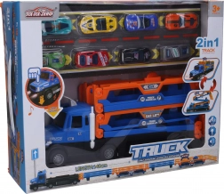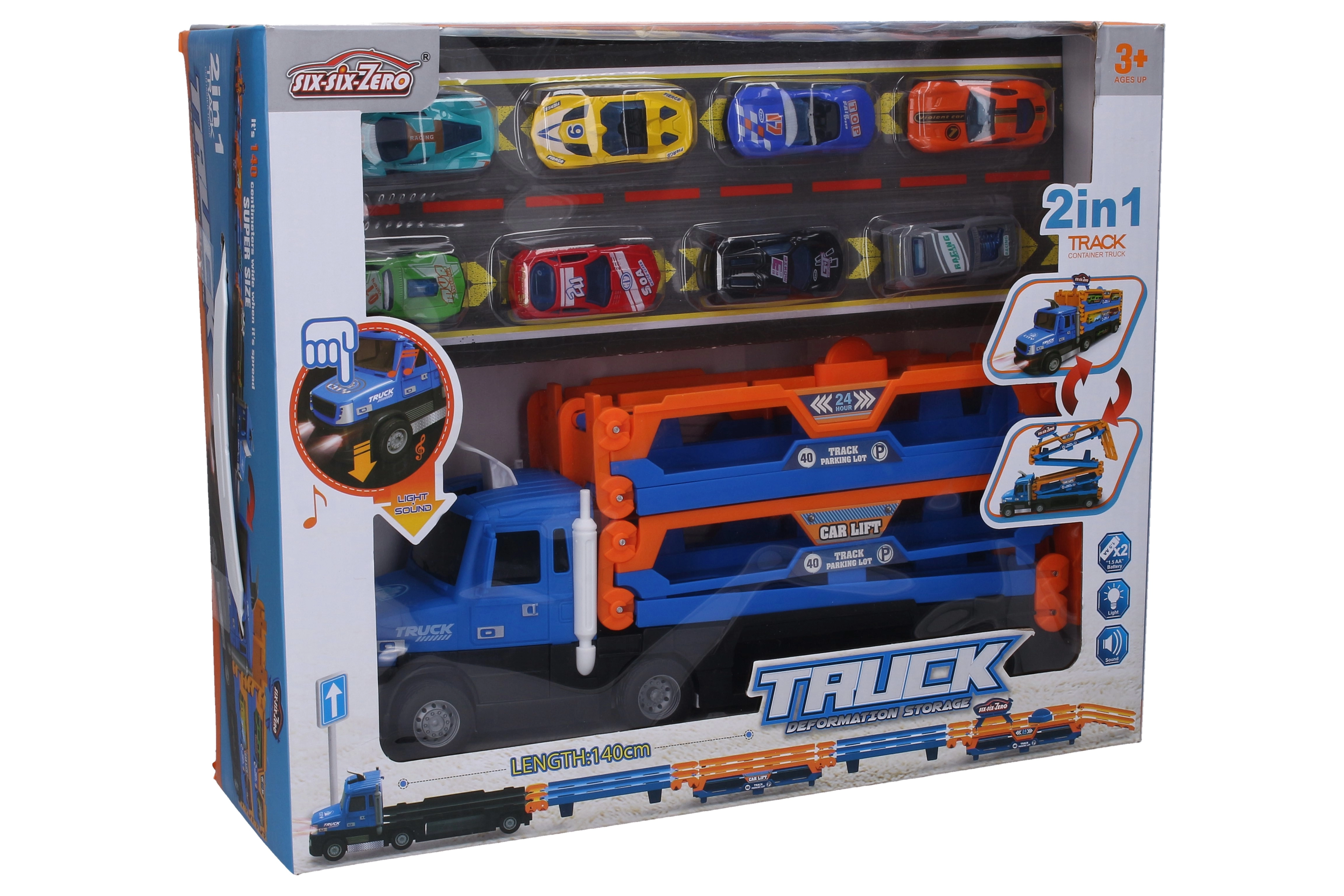 Del paketa je 8 kovinskih avtomobilčkov (pribl. 6,5 cm) s prosto vrtečimi se kolesi, tako da ste pripravljeni na dirko takoj po odprtju. V zloženem stanju ima tovornjak kompaktne mere, kar olajša prenašanje in shranjevanje.