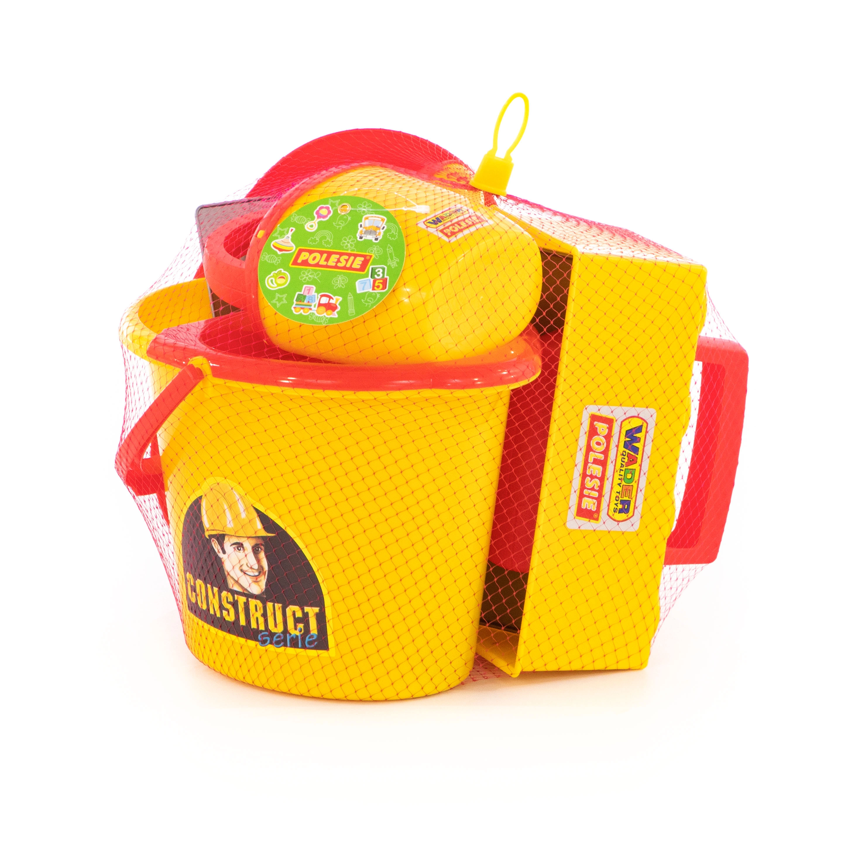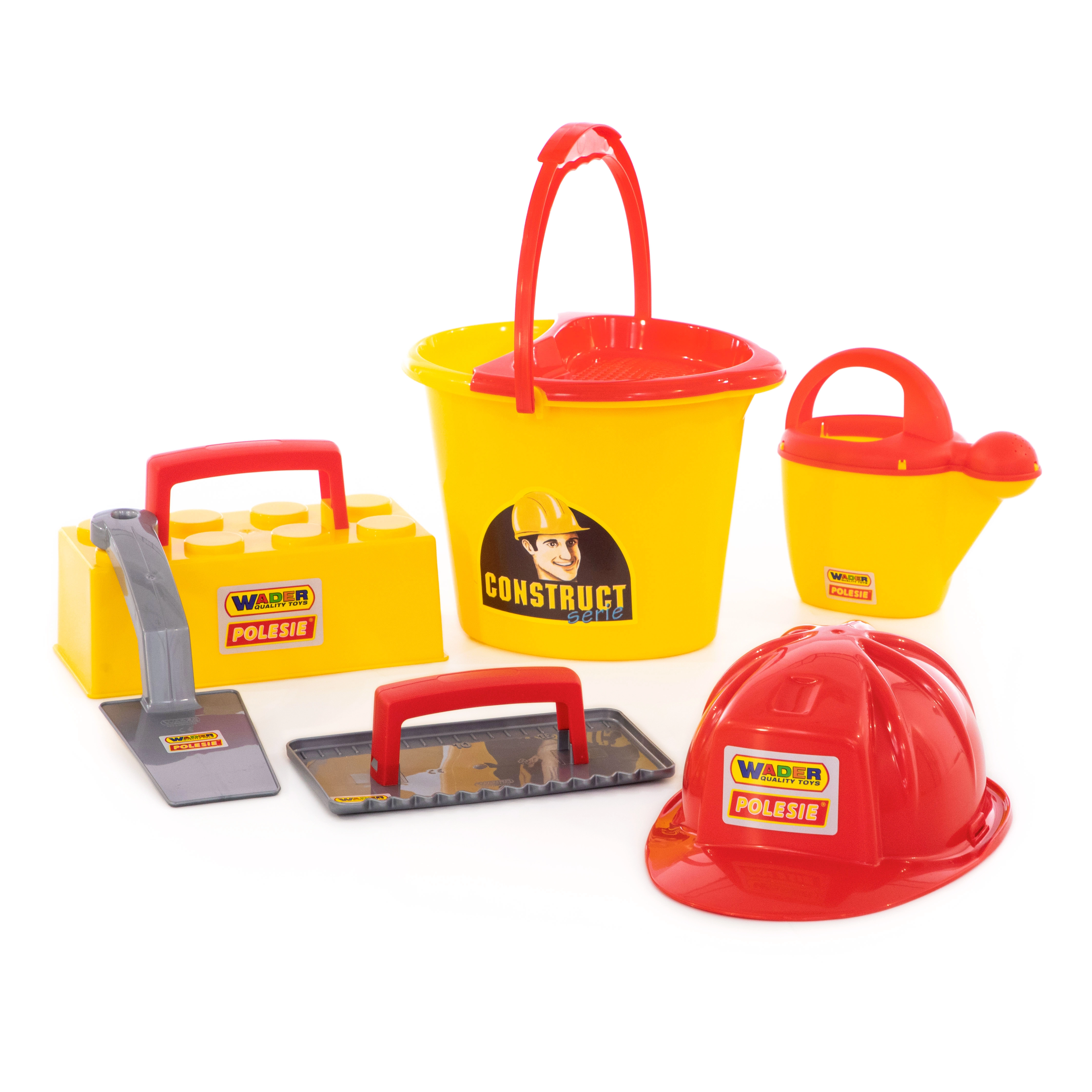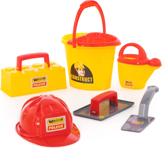 Vse potrebno v enem: vedro, zalivalka, zidarska žlica, gladilka, model za opeke in čelada – pripravljeno za peskovnik in plažo.