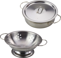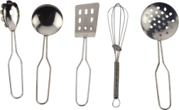 V paketu je pestra izbira posode in dodatkov: lonec s pokrovko, globok lonec z ročaji, ponev, cedilo/sito, metlica, zajemalka, luknjičasta lopatica, polna lopatica, penovka, kuhinjska rokavica in kuhinjska krpa. Set razvija domišljijo, spodbuja igro vlog, uči sodelovanja in organizacije dela v kuhinji.