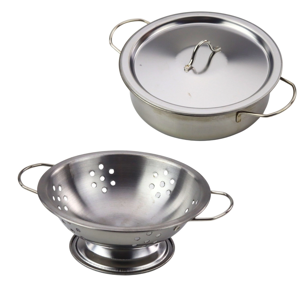 Lonci, ponev in pripomočki so iz trpežne kovine, ki zvesto posnema pravo kuhinjsko opremo – vključno s tipičnim cinkanjem med igro.