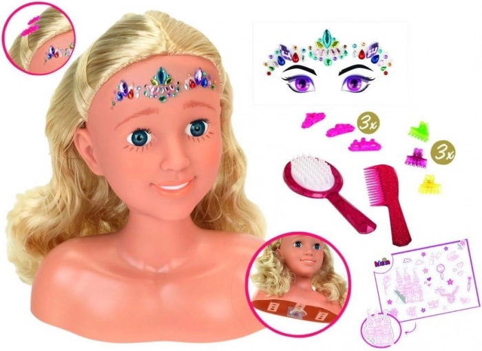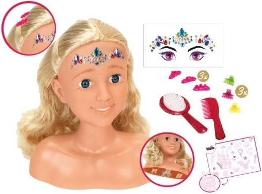 Glava za česanje in stiliranje Sara je odlična izbira za male frizerke in vizažistke. Realistični dolgi blond lasje se zlahka razčesavajo in držijo obliko, zato lahko otroci ustvarjajo kitke, valove in slavnostne figare. Gladek obraz je idealen za varno okraševanje s priloženimi samolepilnimi kamenčki in dermatološko testiranim »kozmetičnim srcem«.