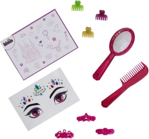 - Bogati dodatki: krtača, glavnik, sponke, nalepke in okrasni kamenčki