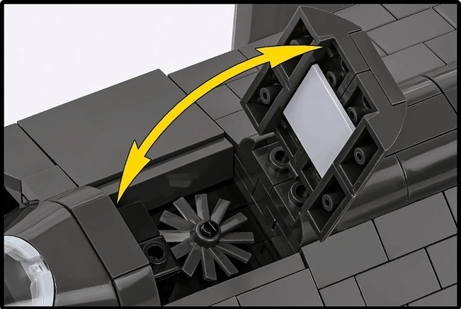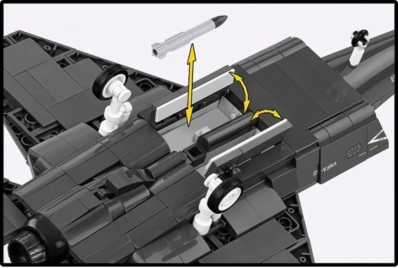 Komplet vsebuje 614 natančno izdelanih kosov z obstojnimi potiski, zato bo videz ostal izrazit še dolgo. Uživali boste v odpirljivi kabini, nastavljivih krmilnih površinah, gumijastih kolesih in bombnici. Ne manjka niti stojalo za učinkovito razstavitev ter figurica pilota v ameriški letalski opremi.
