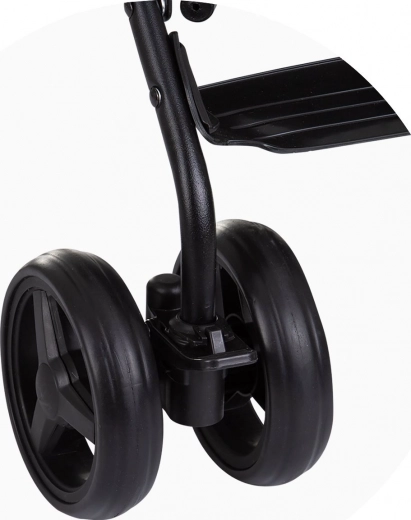 Za vaše udobje je opremljen z udobnimi penastimi ročaji, zložljivo strehico proti soncu in prostranim košem za vse potrebščine. Otrok je zaščiten z 5-točkovnimi varnostnimi pasovi z oblazinjenjem, stabilnost pa zagotavlja povezana zadnja zavora. Dva položaja naslona omogočata hitro prilagoditev počitku ali aktivni vožnji.
