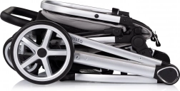 Za otrokovo udobje so tu nastavljivo naslonjalo (3 položaji), 5-točkovni pas z oblazinjenjem in odstranljiv varnostni lok iz eko usnja. Starši bodo cenili višinsko nastavljiv ročaj z varnostnim trakom za zapestje, velik shranjevalni koš in strešico z okencem ter sončnim vizirjem. Zadnja kolesa imajo povezano zavoro, zaskočna blokada pa sedežni enoti in košari dodaja dodatno stabilnost. Voziček izpolnjuje evropska standarda EN1888-1 in EN1888-2.