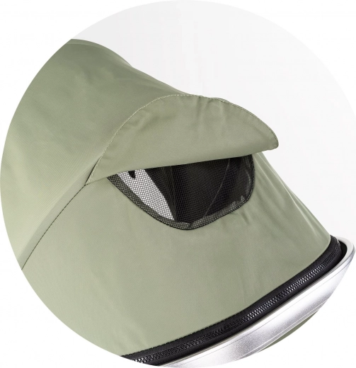 Nastavljivo naslonjalo v 3 položajih, nastavljiva strehica z odstranljivo sončno zaslonko in okencem ter oblazinjena zimska pregrinjalka za noge otroku nudijo maksimalno udobje v vsakem vremenu. Varnostna oprema vključuje 5-točkovni pas z mehkimi blazinicami, odstranljiv varovalni lok z oblogo iz eko usnja, povezano zadnjo zavoro in varnostni pašček na ročaju. Velik koš in previjalna torba olajšata vsakodnevne sprehode.