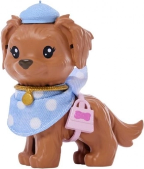 Punčka ima artikulirane okončine za različne poze, medtem ko kužek z dodatki doda igri realističen pridih. Stil dopolnjujejo baretke, ogrlice, torbica in povodec, vse usklajeno v modnem videzu s pikami.