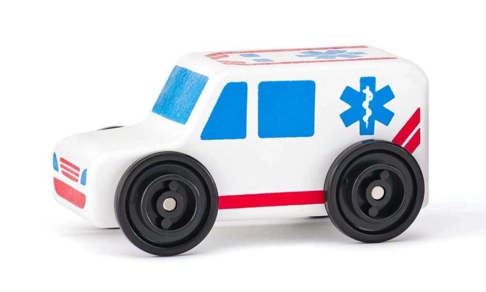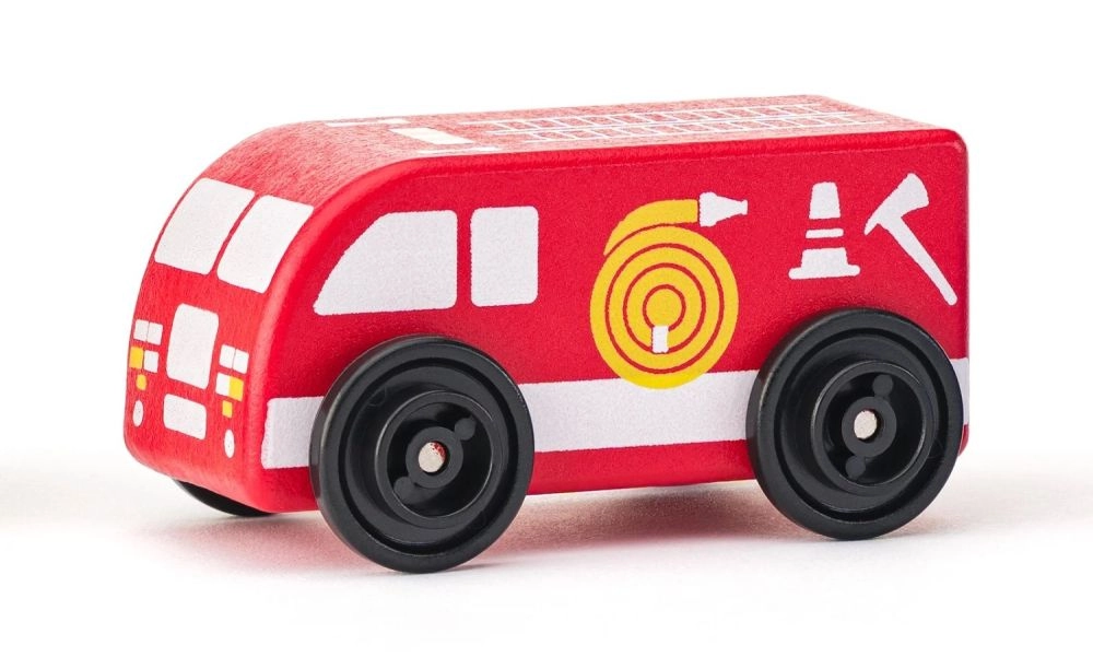 Reševalno vozilo, gasilski avto, policija, taksi, avtobus in dostavnik – šest različnih vlog za domiselno igro in učenje o delu služb za nujno pomoč ter prometu.