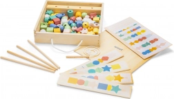 Nizanje perlic na vrvice in lesene paličice podpira spretnost prstov in koordinacijo oko–roka, idealno za predšolske veščine.
