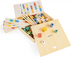 Del kompleta so barvne geometrijske oblike, vrvice za nizanje in obojestranske kartice z vzorci za sestavljanje sekvenc. Zahvaljujoč sortirnim stojalom otroci zlahka posnemajo vzorce, se učijo pravilnosti in razvijajo predmatematične veščine.