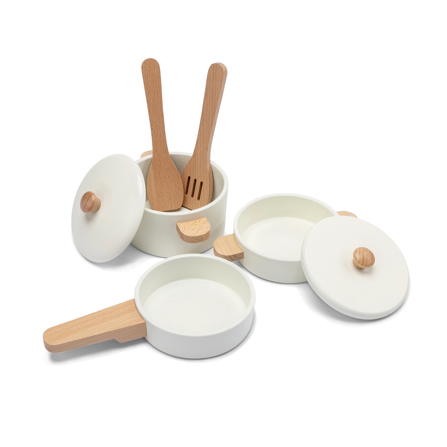 Ta eleganten komplet otroških lesenih posod v beli barvi je popoln dodatek za vsako otroško kuhinjico. Vsebuje lonček s pokrovko, ponve in leseni pripomočki, vse z gladko površino in prijetnimi, naravno ujemajočimi se ročaji za zanesljiv oprijem majhnih rok.