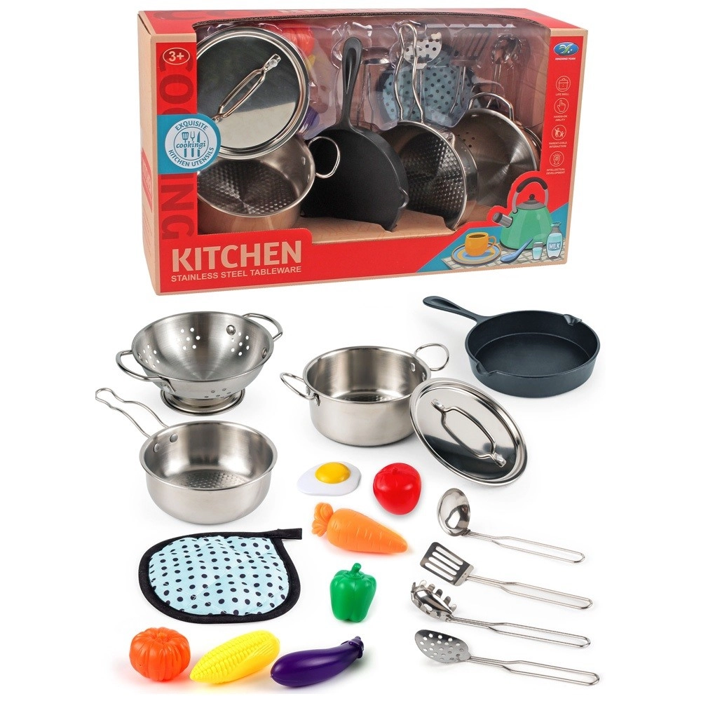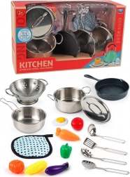 Ta celovit komplet posod zagotavlja otrokom pristno izkušnjo kuhanja. Kovinska posoda je trpežna, dobro leži v roki, dopolnjujejo pa jo realistični dodatki – vključno s plastično zelenjavo in praktično tekstilno podlogo. Idealno za otroške kuhinje ter skupno igro s starši ali prijatelji.
