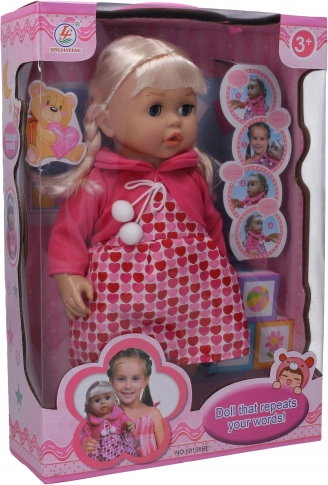 Zabavna lutka, ki ponovi, kar poveste! S pritiskom na desno roko se začne snemanje, s pritiskom na levo roko pa lutka vaš posnetek predvaja. Velikost 40 cm. Interaktivna igrača za razvoj govora in zabavo. Enostavno upravljanje s pomočjo gumbov v rokah. Baterije 2× AA niso priložene.