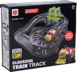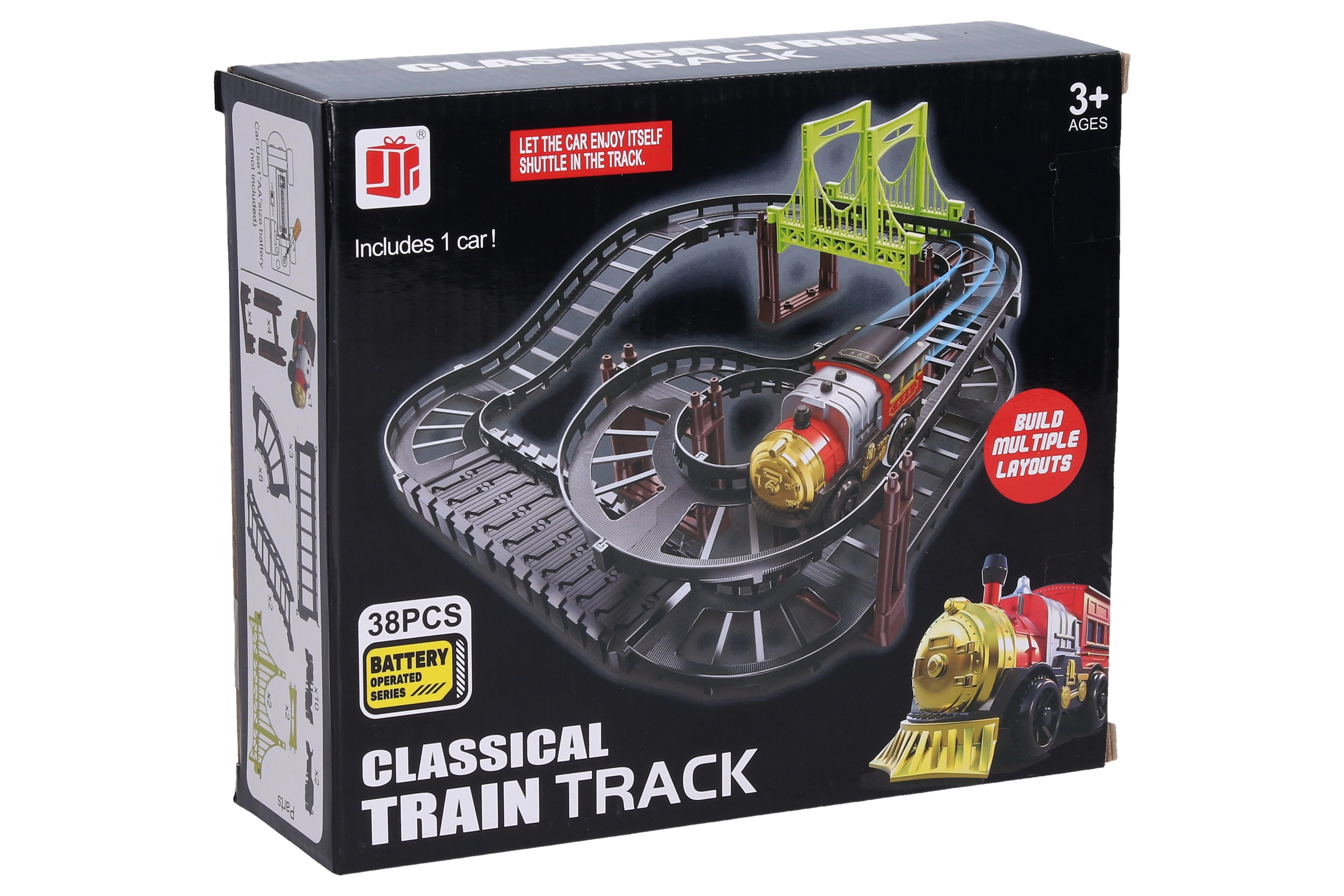 V kompletu je 38-delni set tirov in dodatkov, ki spodbuja razvoj motorike in domišljije. Baterija 1× AA (ni priložena) napaja vlakca. Navodila za sestavljanje najdete neposredno na embalaži.